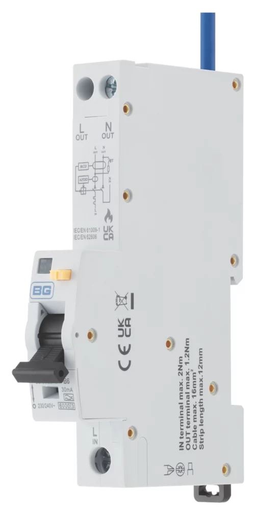 18th Edition Amendment 2. Single module combined AFFD and RCBO device Type A, providing the highest levels of protection for the installation and users. Offers effective protection against fires that are started by electrical arcing faults. Suitable for use on circuits which may produce pulsed DC currents. B curve trips between 3-5 times the rated device current. For use with BG Fortress consumer units.