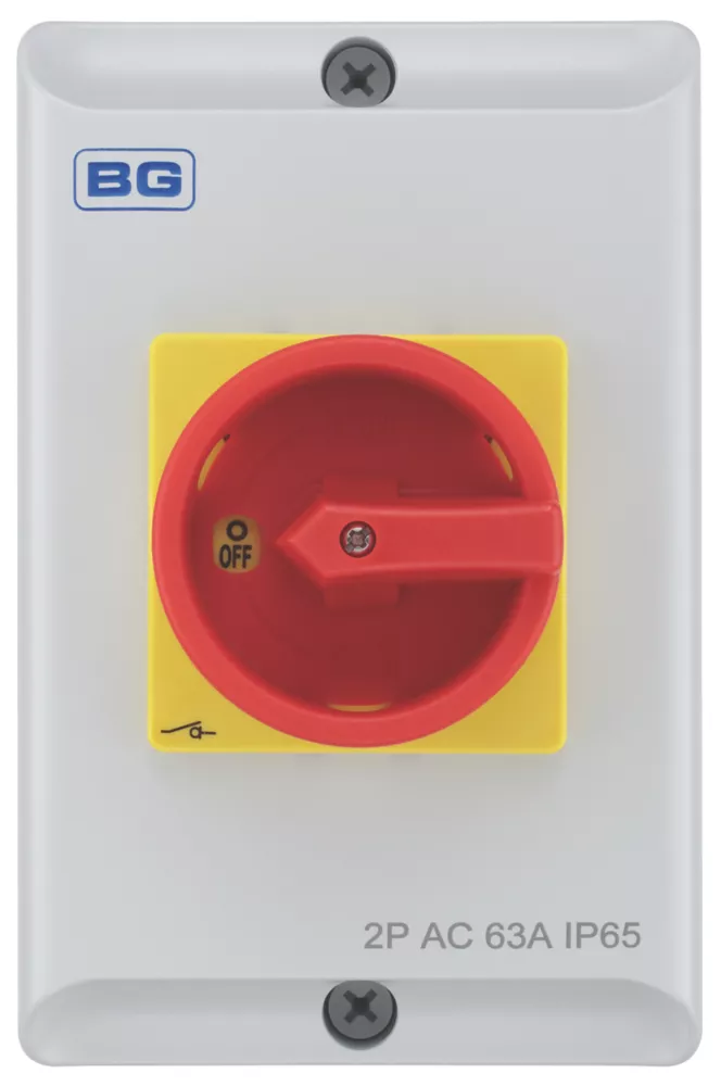 Weatherproof, plastic 63A insulated rotary isolator, offering an easy solution for isolating or switching single-phase equipment. Features easy cable access via M20 knock-outs (top and bottom), switch interlocking with lid to prevent opening in ‘on’ position and red and yellow handle with captive cover screws, lockable by padlock. Earth terminals included.