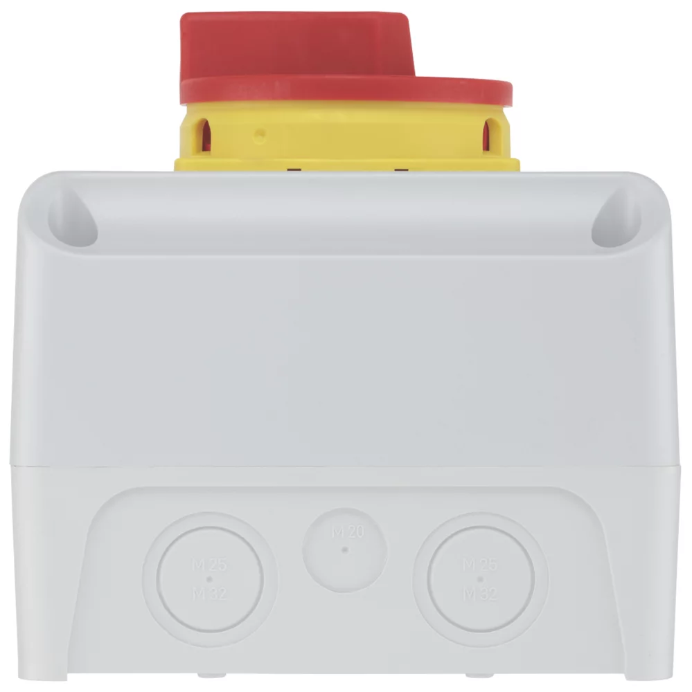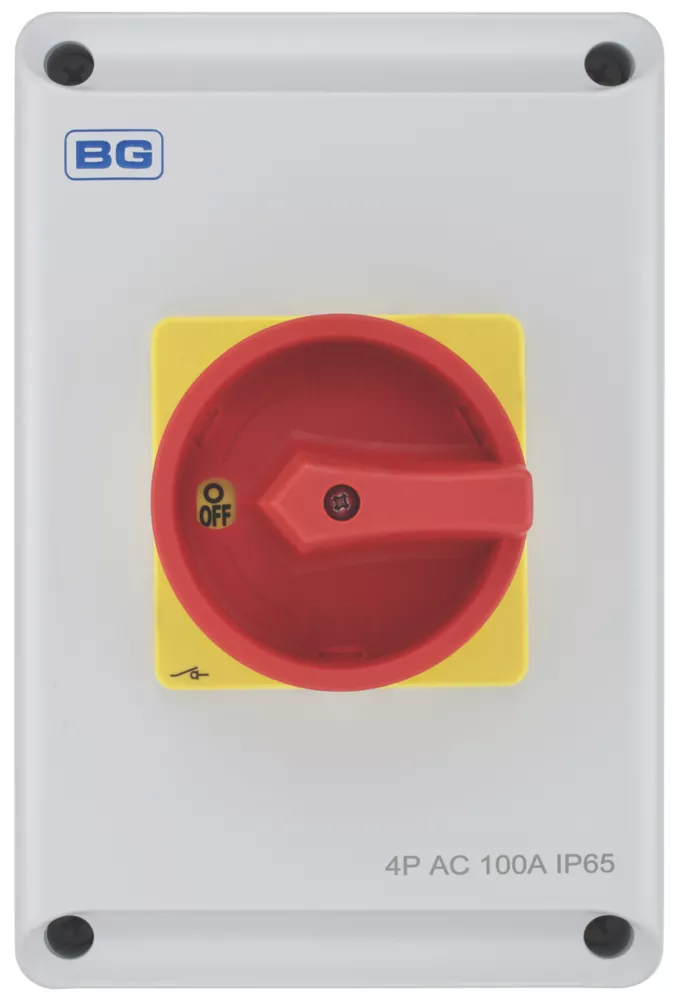 Weatherproof, plastic 100A insulated rotary isolator, offering an easy solution for isolating or switching 3-phase equipment. Features easy cable access via M20 knock-outs (top and bottom), switch interlocking with lid to prevent opening in ‘on’ position and red and yellow handle with captive cover screws, lockable by padlock. Earth terminals included.