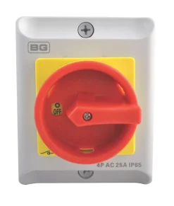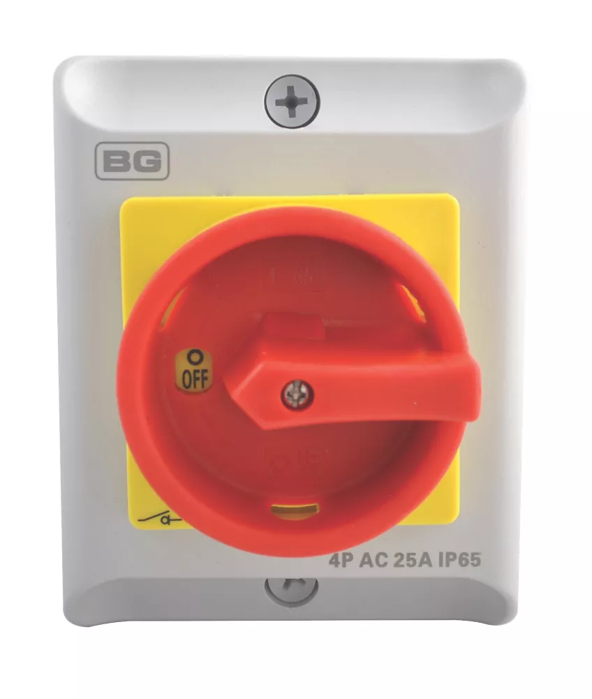 4-pole rotary isolator switch disconnector used to switch power to commercial / light industrial applications. Can be used as an emergency stop and can be locked in the off position using a padlock (not supplied). Switch is interlocked with the lid to prevent opening in the on position.