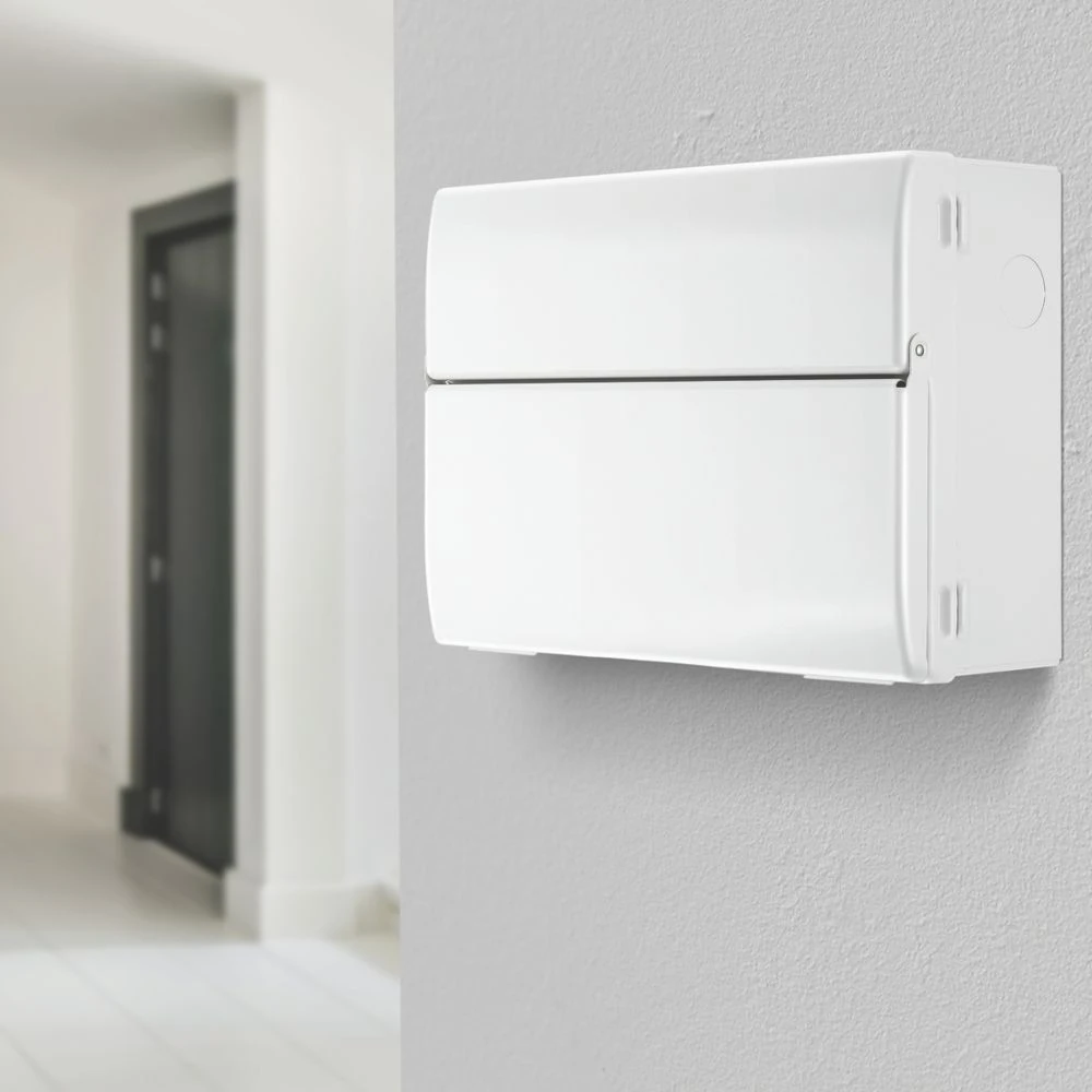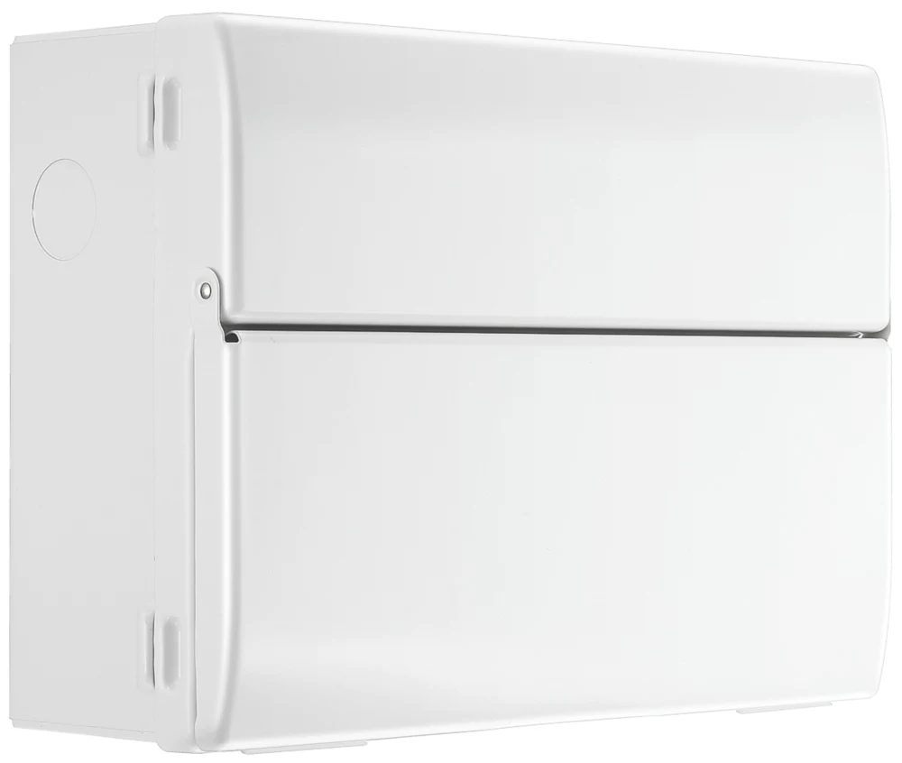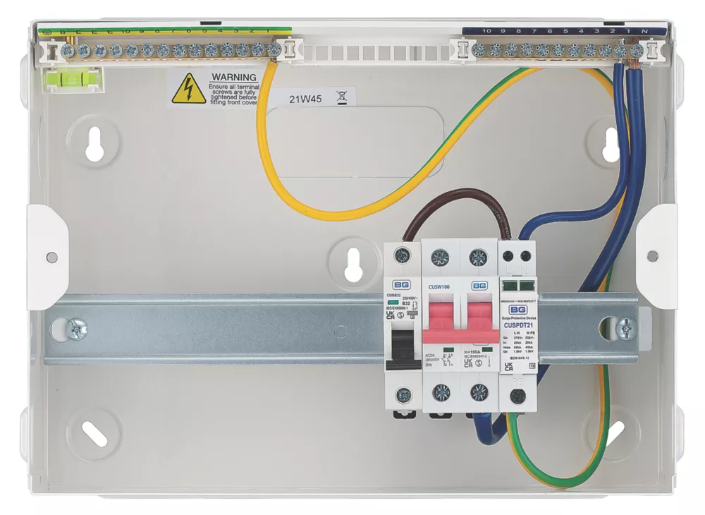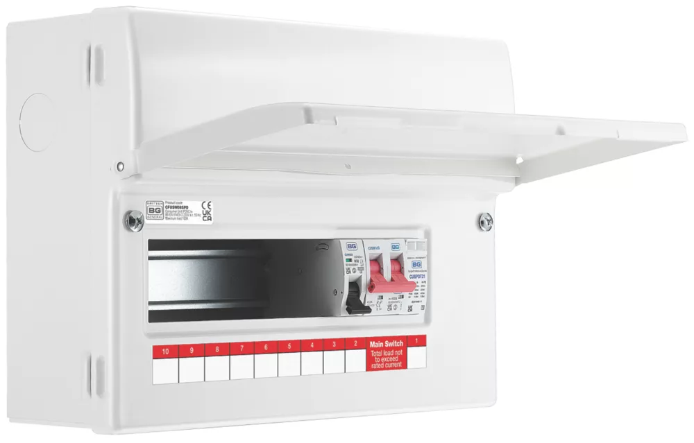 18th Edition Amendment 2. Features integrated spirit level, all internal cables, terminals, busbar, labels and blanks. Modern, stylish design and profile with flexible circuit combinations. Fast, easy installation with backed-out, retained terminal screws and captive cover screws. High gloss finish matches all other BG wiring accessories.