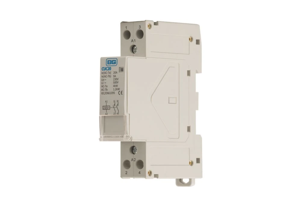 20A. Double pole. Single-module. For use with consumer units and enclosures. Used to switch a circuit on or off from another circuit. Ideal for controlling large lighting loads, heating or ventilation systems.