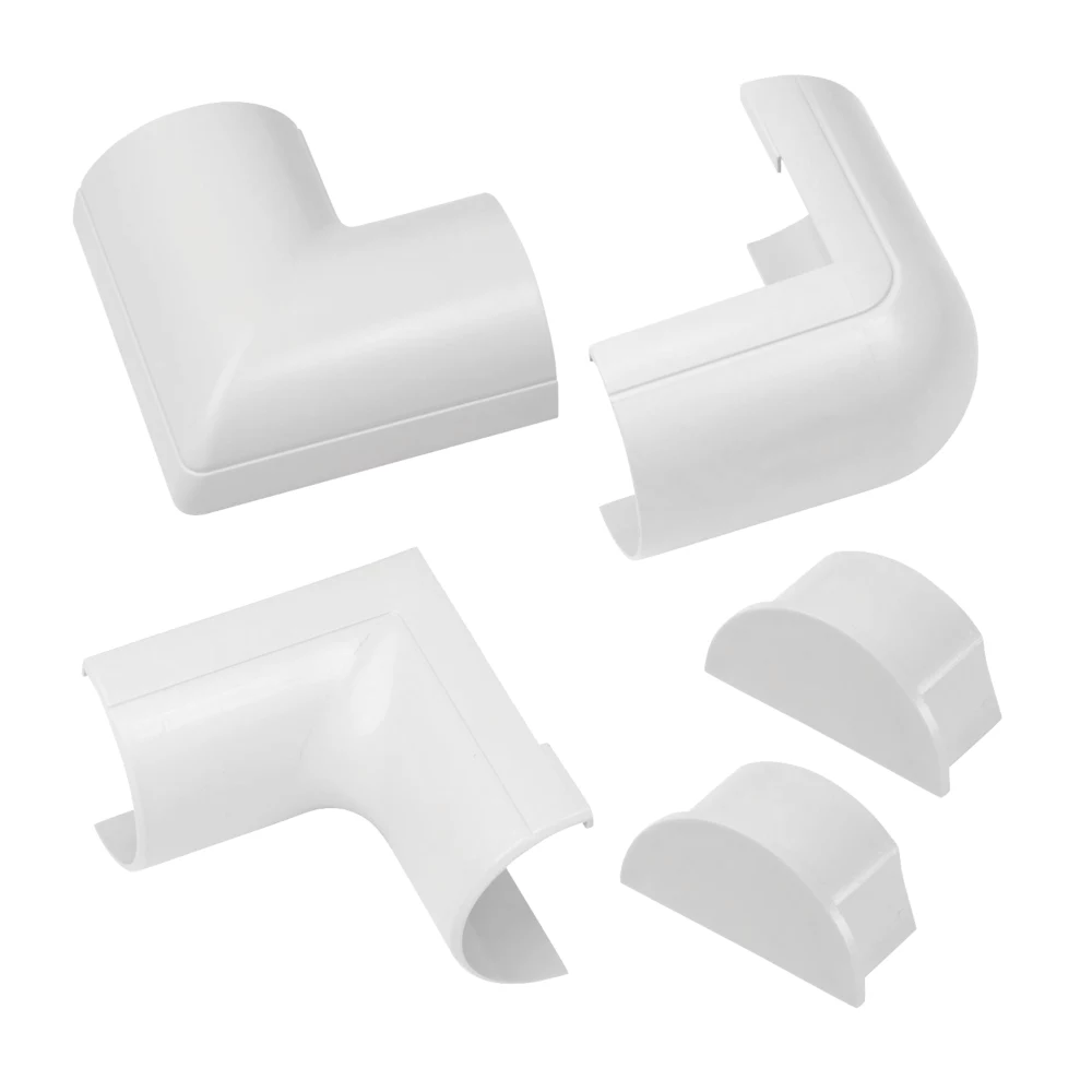 Clip-over accessories for use with D-Line 50 x 25mm white ½-circle TV trunking. Bends clip-over trunking length ends without the need to mitre cut. Radius facilitates cable bends and secure grip-tabs on bends lock behind lengths.