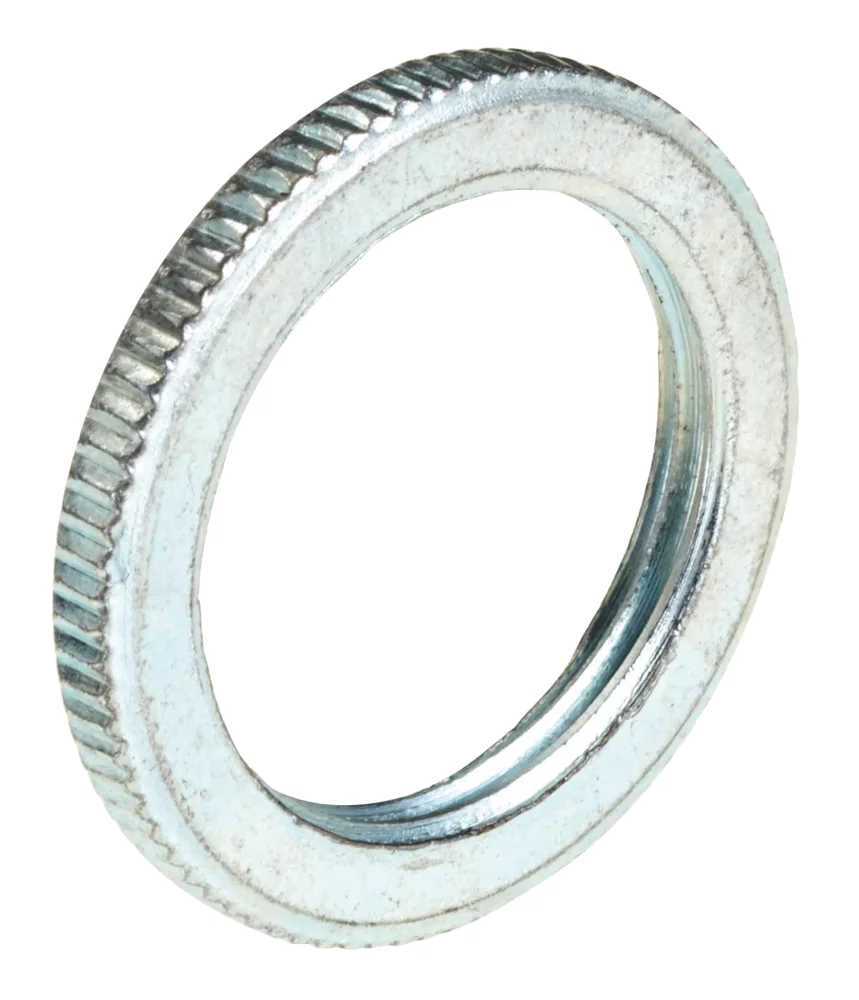 Bright zinc-plated metal milled-edge lock rings. 25mm inner diameter.