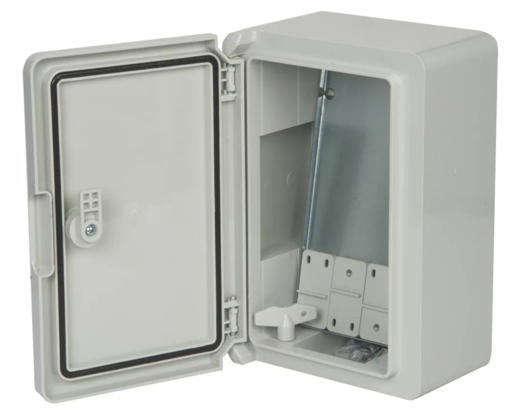 Lockable blank door enclosure produced from ABS-HB (UV) plastic. Supplied complete with galvanised steel back plate and mounting brackets.