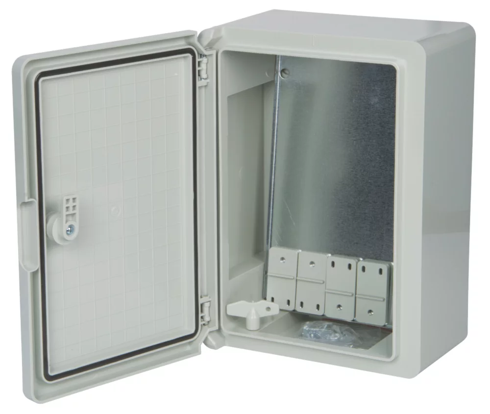 Lockable blank door enclosure produced from ABS-HB (UV) plastic. Supplied complete with galvanised steel back plate and mounting brackets.