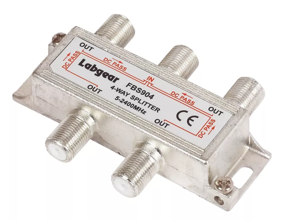 Passive UHF/VHF compact splitter with power pass to all ports. 75ohm F-connectors throughout.