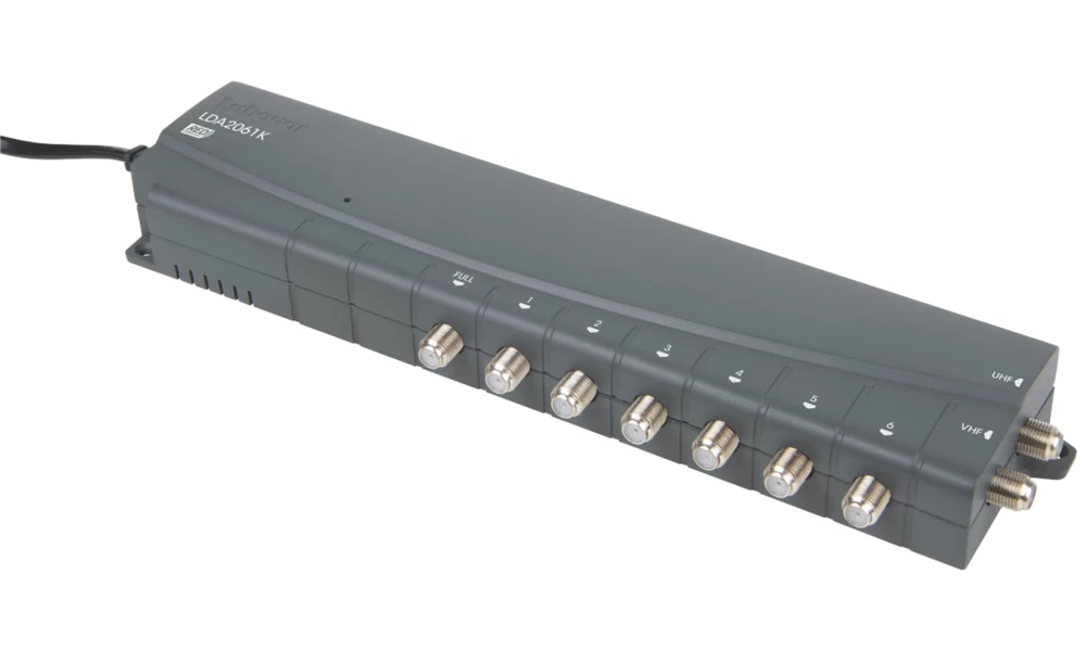 Expandable 6-way TV and radio signal amp. Full output can be split to feed an additional 8 points. Line-power on UHFTV input for a masthead pre-amp. Compact housing with F-connectors.