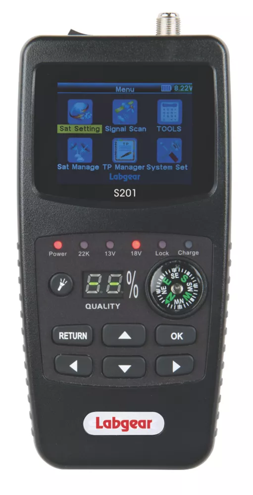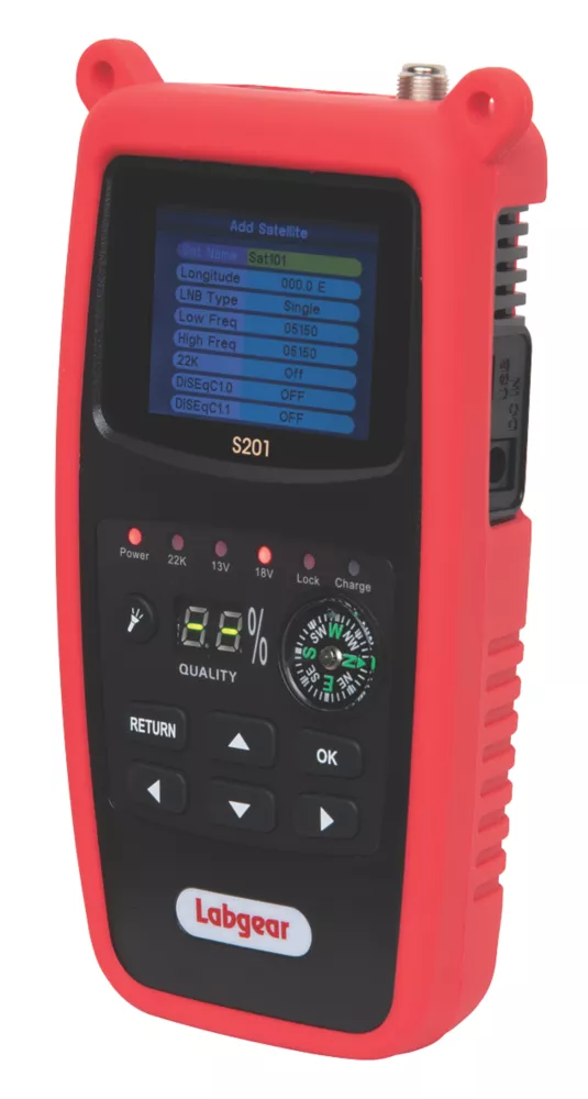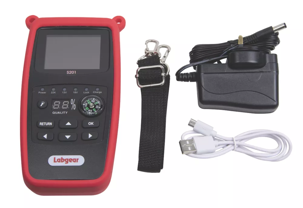 Measures signal level and quality for pinpoint alignment. Gives sound and visual displays to help lock onto the best signal. Includes data on 100 satellites and calculates best dish alignment.