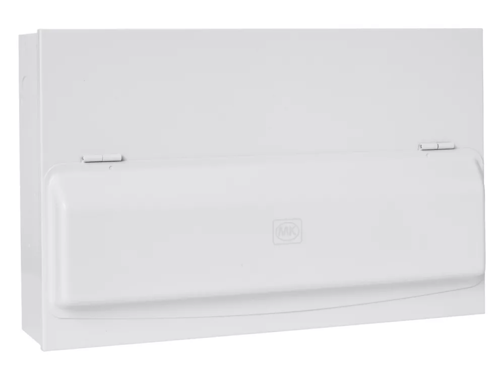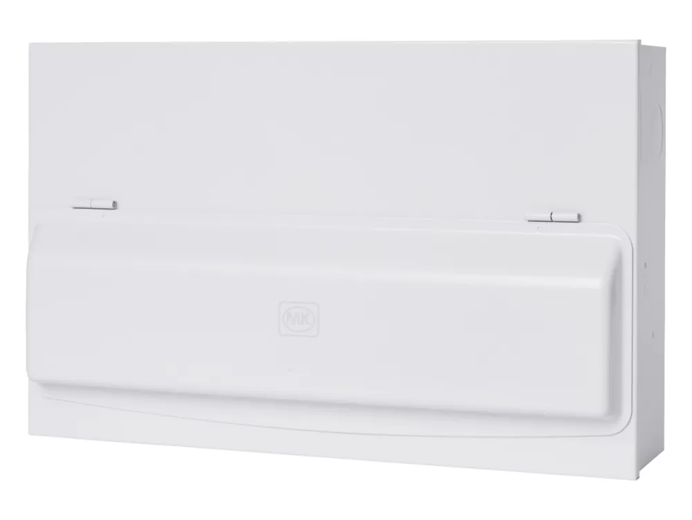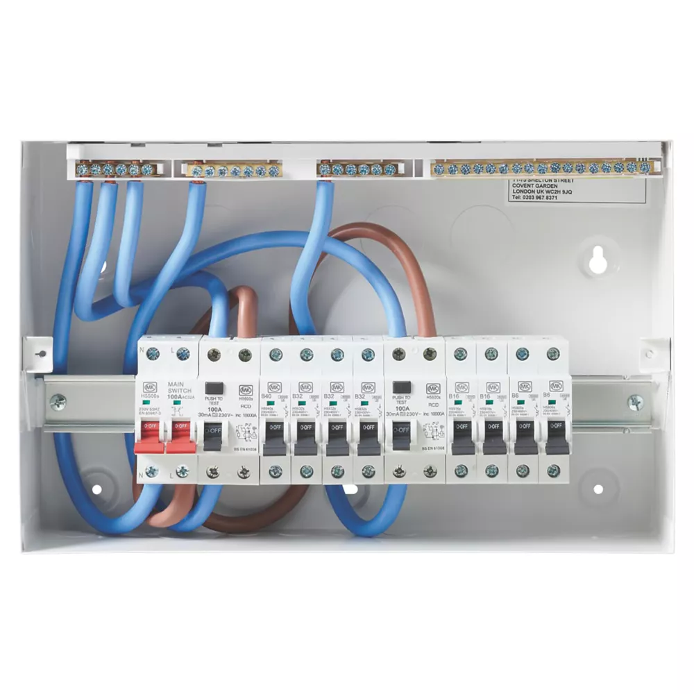 18th Edition Amendment 2. Top-hinged door ensures door remains closed while unit is not in use. Includes 100A switch with two 100A RCCBs and 8 MCBs.