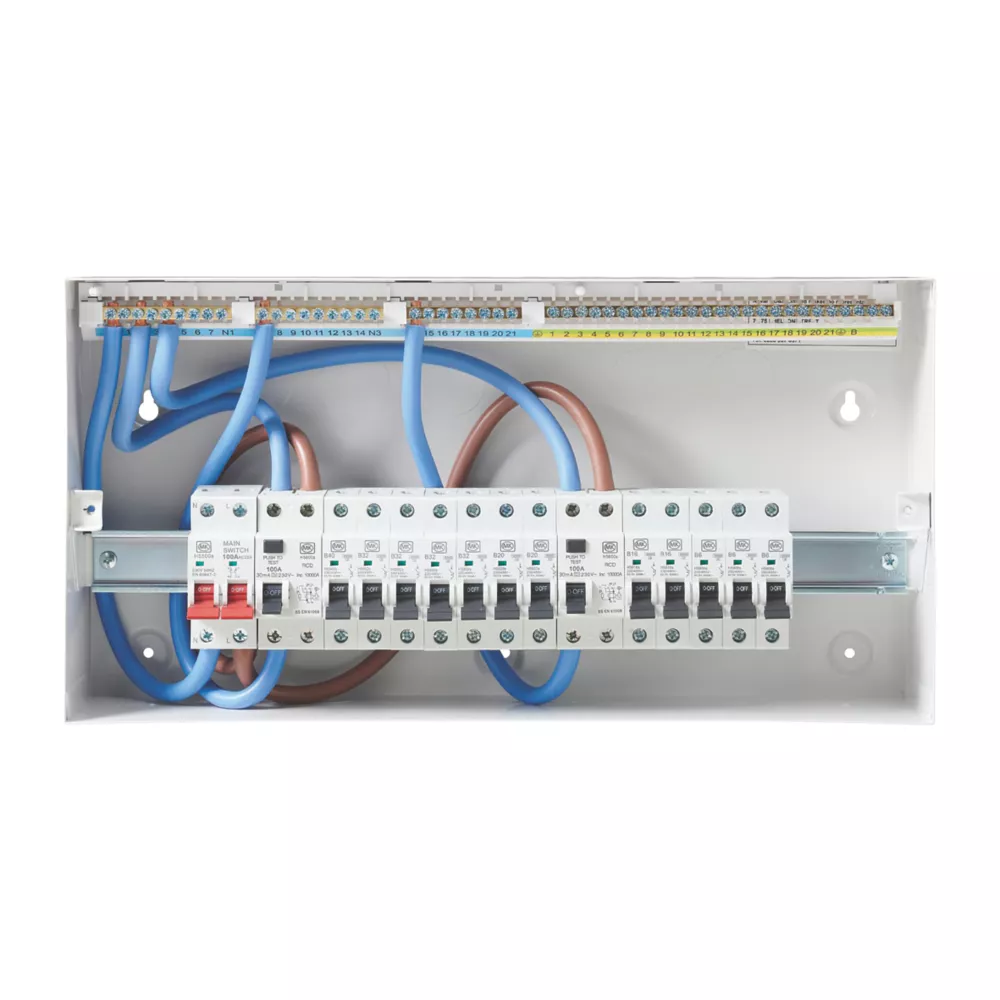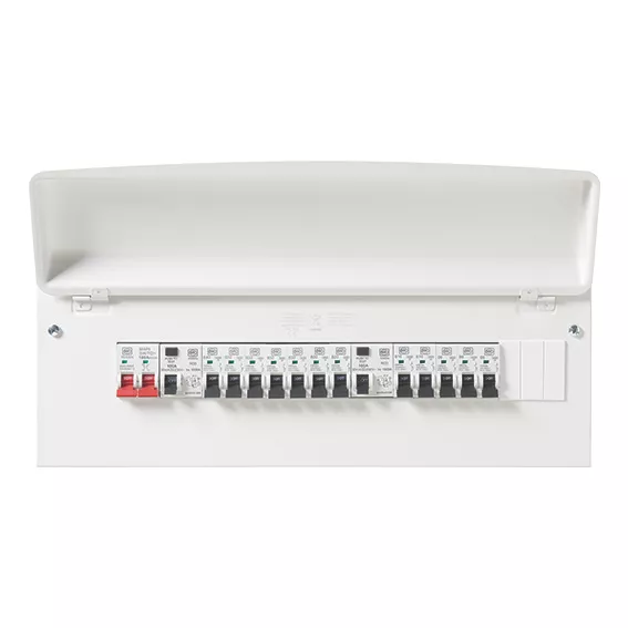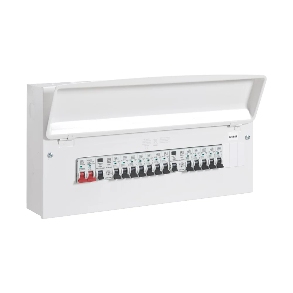 18th Edition Amendment 2. Top-hinged door ensures door remains closed while unit is not in use. Includes 100A switch with two 100A RCCBs and 12 MCBs.