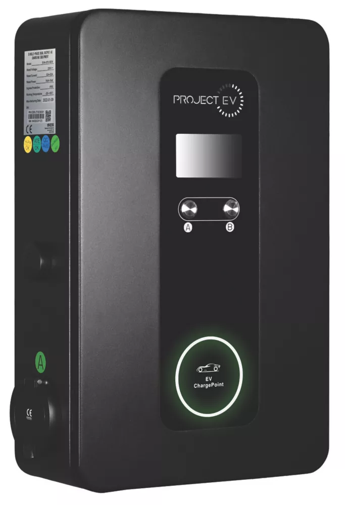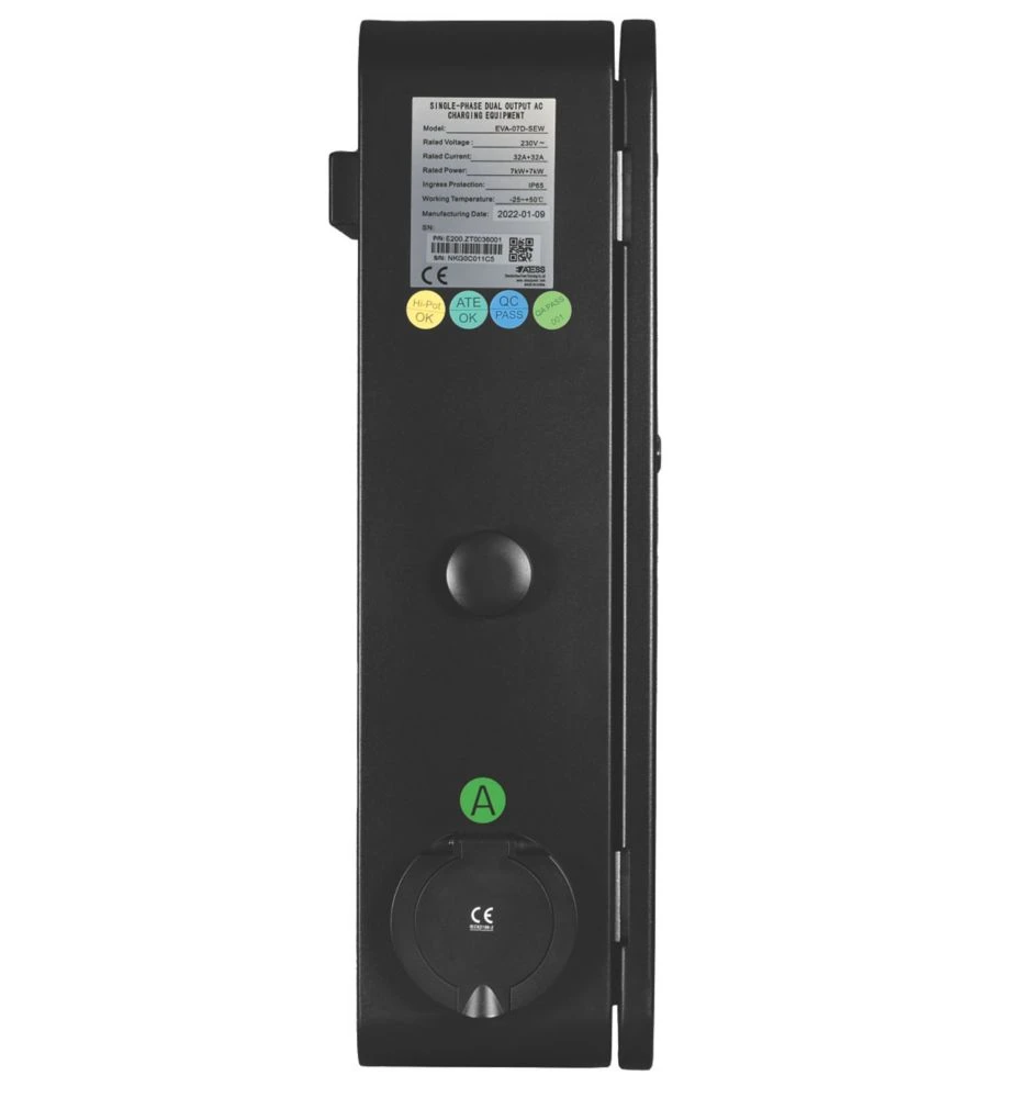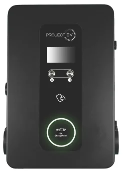 Single-phase dual-AC charging unit with no earth spike required for installation. Dual-gun charger is perfect for both domestic and commercial use. Features a cable lock system for added security, mobile monitoring app, dynamic load balancing system and an option for utilising solar energy.