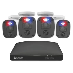 Heat and motion-based activity triggers red and blue flashing lights, bright spotlights and loud sirens to intimidate intruders and prevent crime. Activity can trigger push notifications and recording, with microphones to provide live and recorded audio capture. Features Night2Day for colour video at any hour, powerful infrared night vision up to 30m and TrueDetect for heat and motion detection. Video can be watched live or via playback using the Swann Security app on a smart device. Weatherproof camera designed to withstand the elements.
