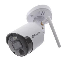 Security camera with bright spotlights, loud siren and 2-way audio to intimidate intruders and prevent crime. Powerful infrared night vision up to 30m and Night2Day which allows colour video at night up to 10m or black and white up to 40m during total darkness (with spotlights on). True Detect heat and motion technology senses people and cars for reliable monitoring and fewer false alarms. Camera plugs into power and video signal is transmitted to NVR wirelessly, meaning it can be installed without the need for drilling and running cables. SwannNet technology allows user to select whether camera connects to NVR or home Wi-Fi. Can be controlled using Swann Security app. Built to withstand the elements all year round.
