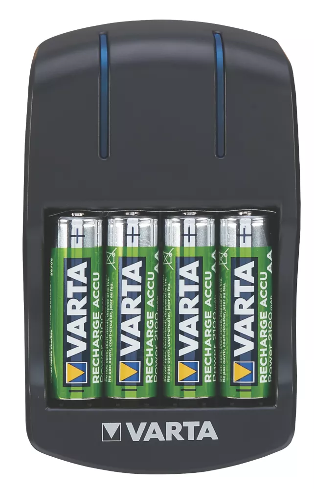 Plug charger allows easy recharge of AA and AAA rechargeable batteries in approx. 5 hours. Charges 2 or 4 x AA or AAA batteries. Blue LEDs indicate charging status. Safety timer avoids overcharging cells.