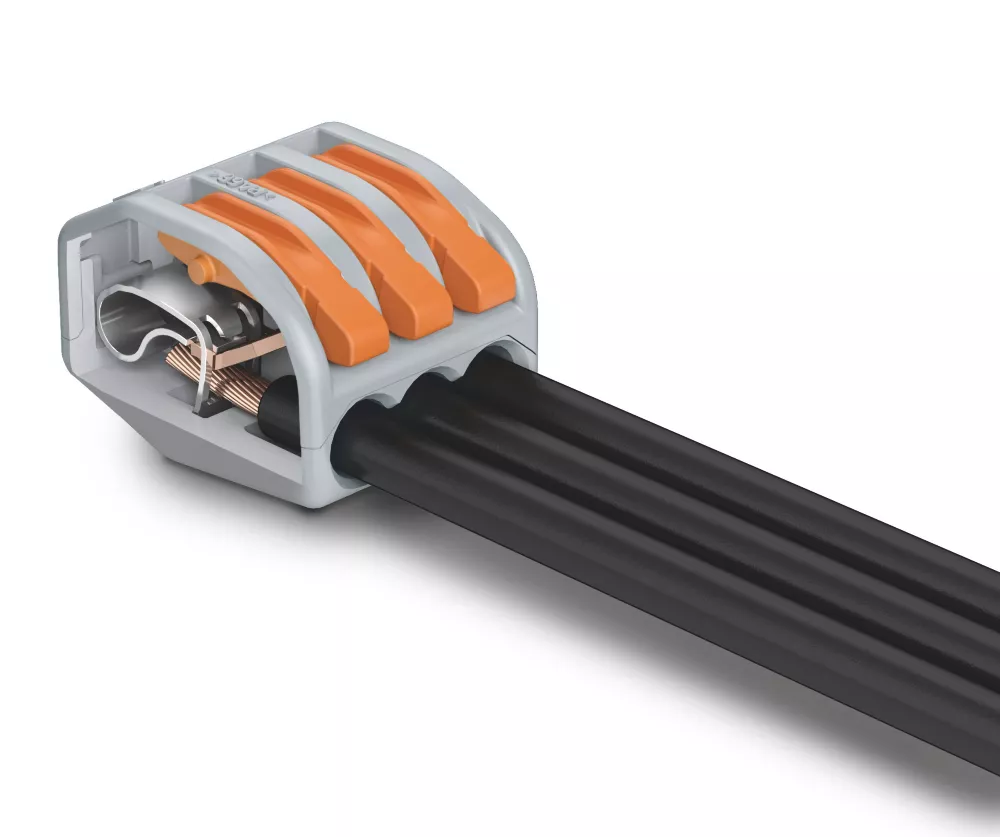 Simple and reusable, 2-way lever-operated connector for solid, stranded or flexible conductors.