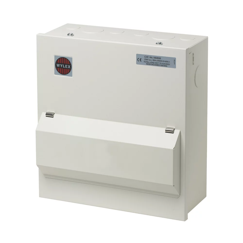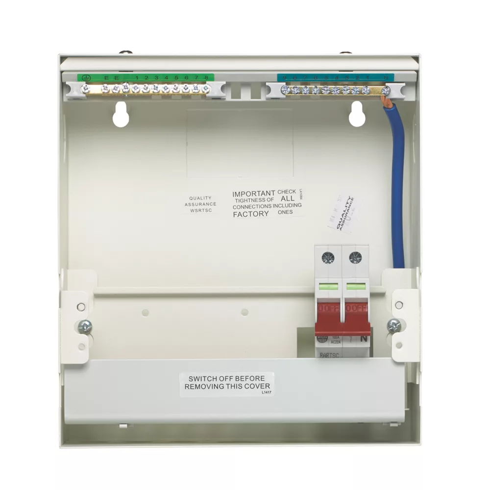 18th Edition Amendment 2. All-metal enclosure consumer unit with 100A double pole main switch and space for 8 x Wylex MCBs or RCBOs. No-miss terminal, fixed busbar and cable entry knockouts on the top, bottom, left, right and rear. Ideal for small power distribution installations or extension to an existing installation.