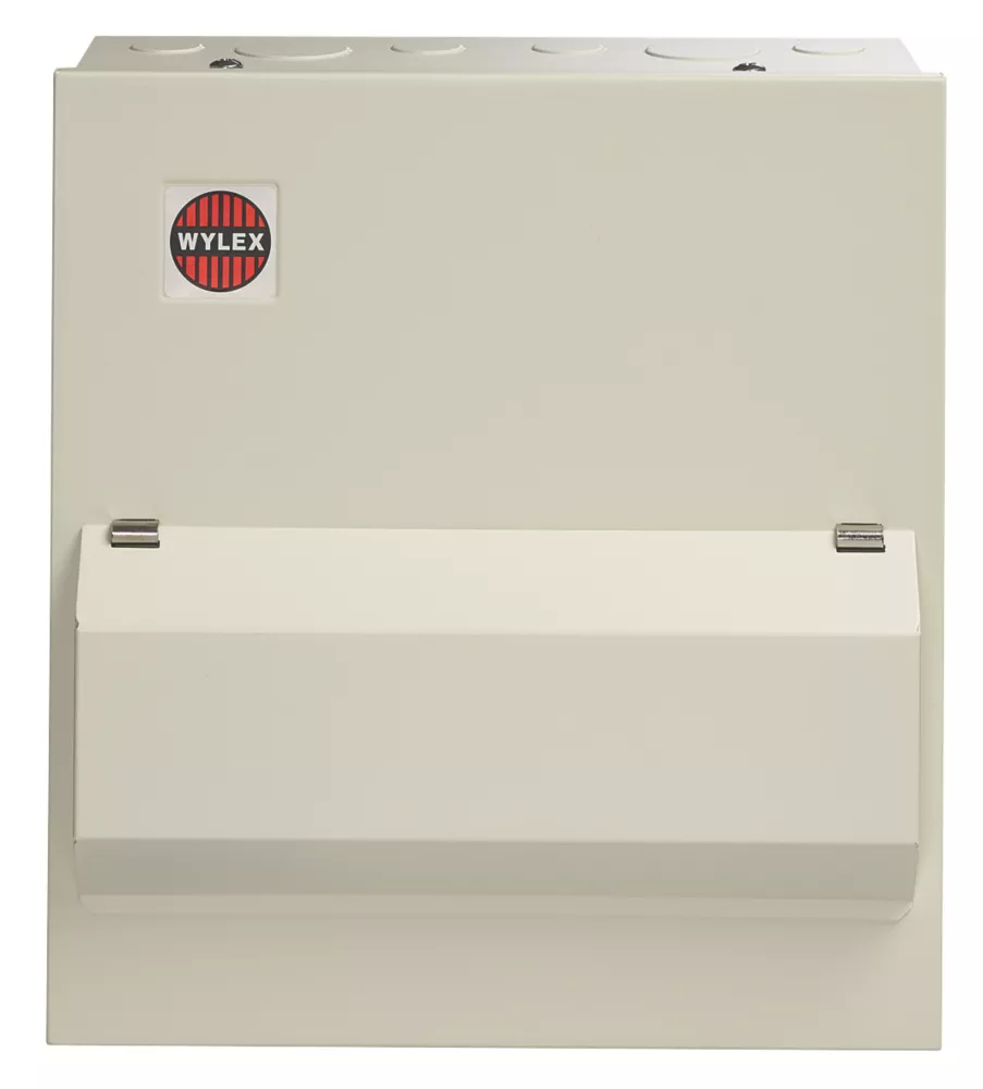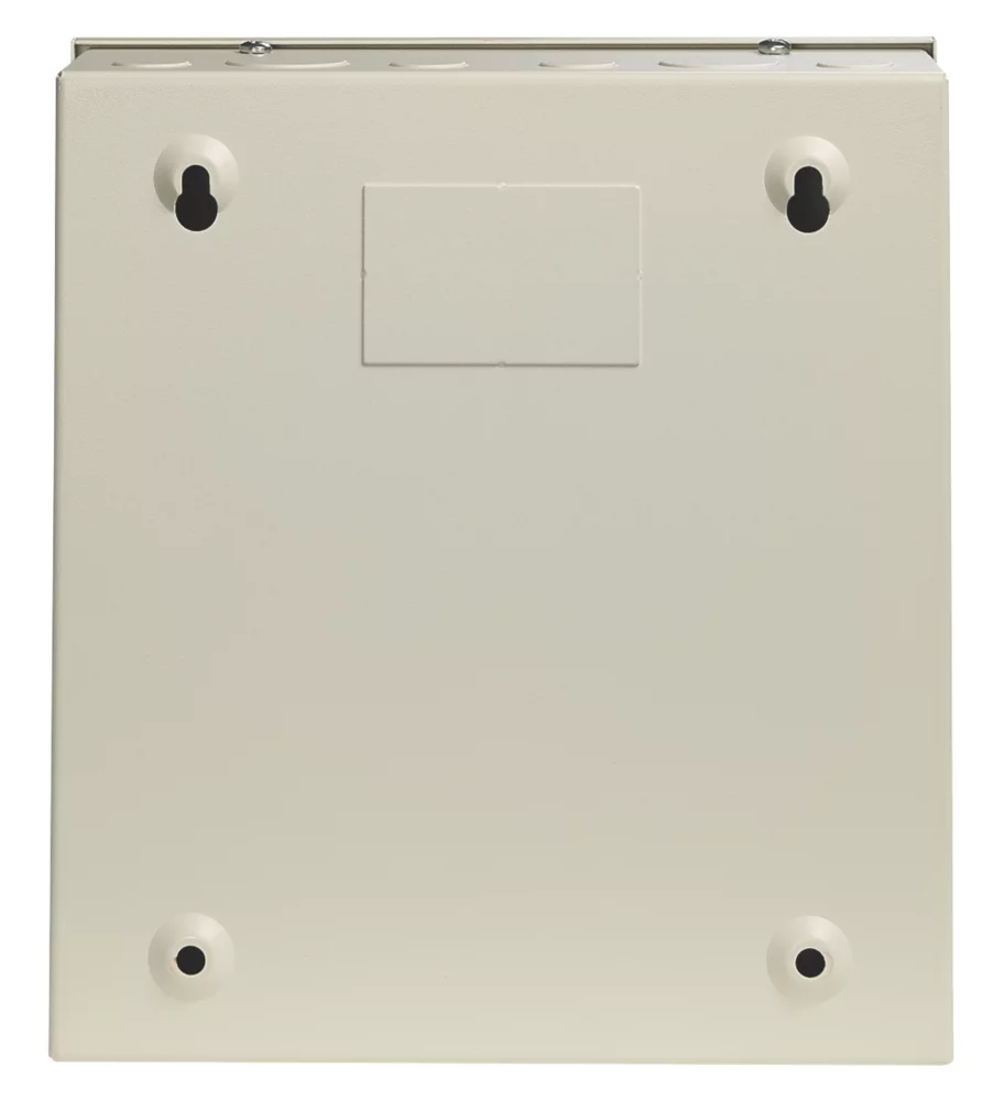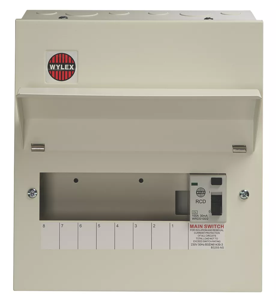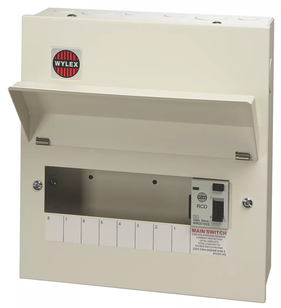 18th Edition Amendment 2. All-metal enclosure consumer unit with 100A 30mA type A RCD and space for 8 x Wylex MCBs. No-miss terminal, fixed busbar and cable entry knockouts on the top, bottom, left, right and rear. Ideal for medium-sized power distribution installations.