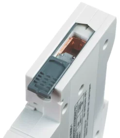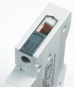 Miniature circuit breaker with front-operated din rail release clip, dolly switch reset mechanism and in-built tunnel shield. ‘No miss’ tunnel terminals on top and bottom.