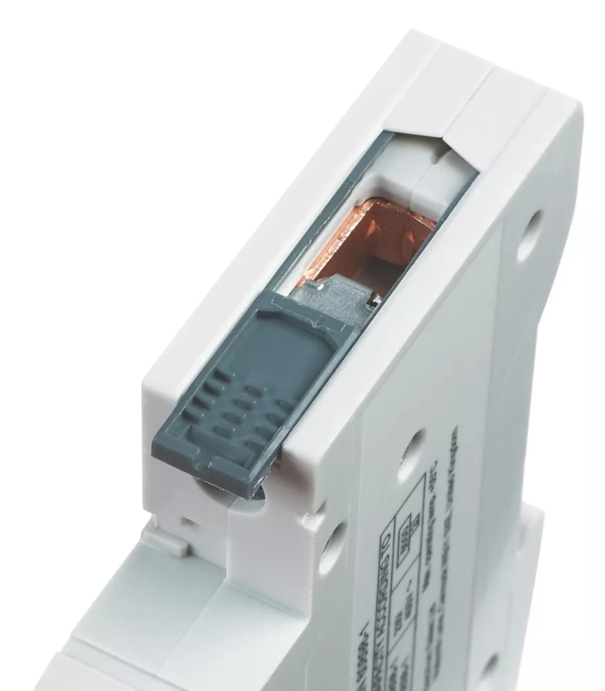 Miniature circuit breaker with front-operated din rail release clip, dolly switch reset mechanism and in-built tunnel shield. ‘No miss’ tunnel terminals on top and bottom.