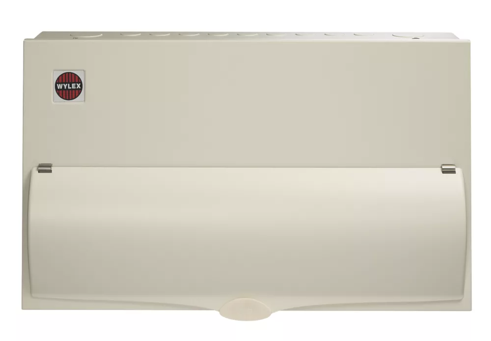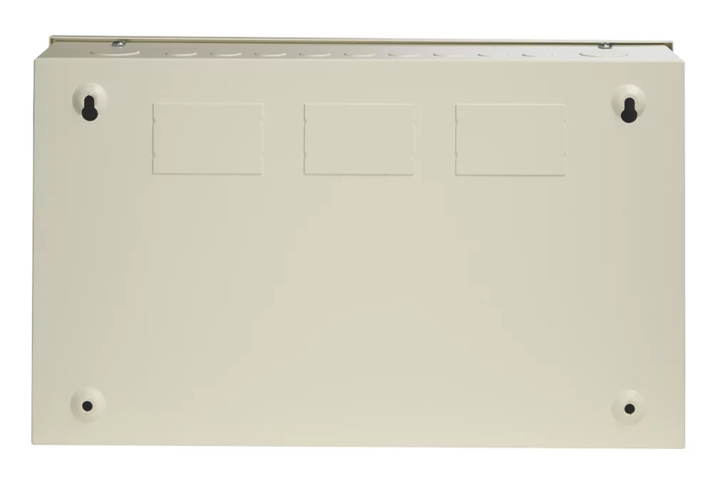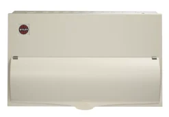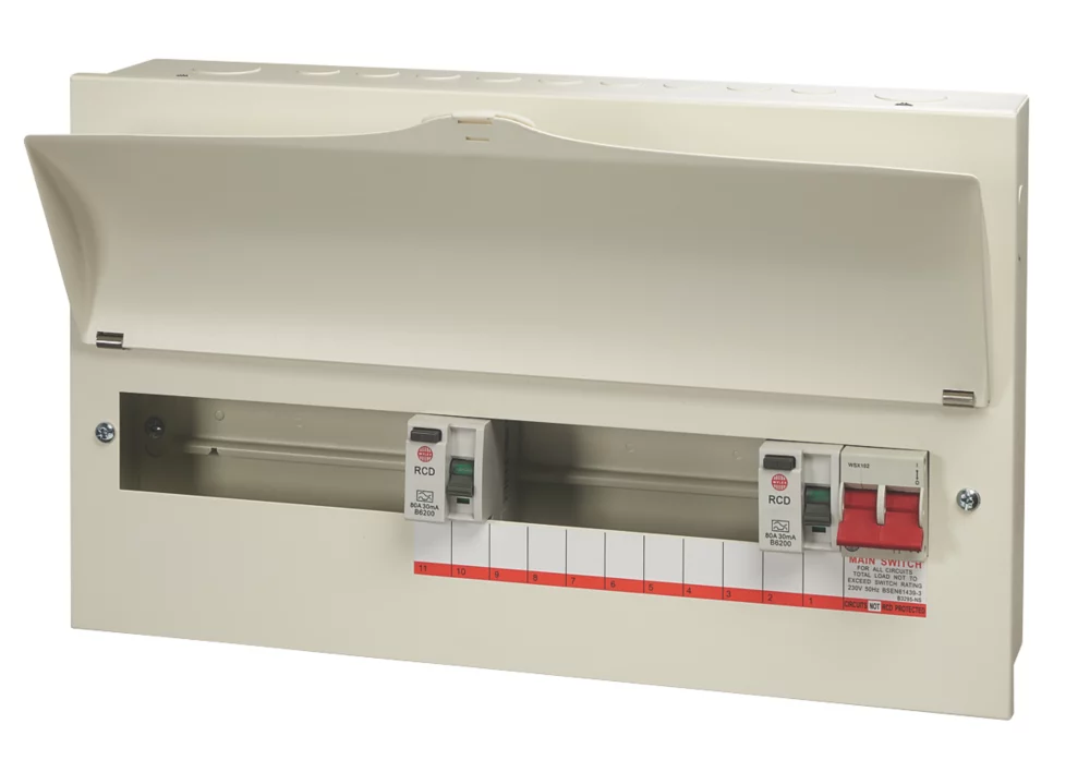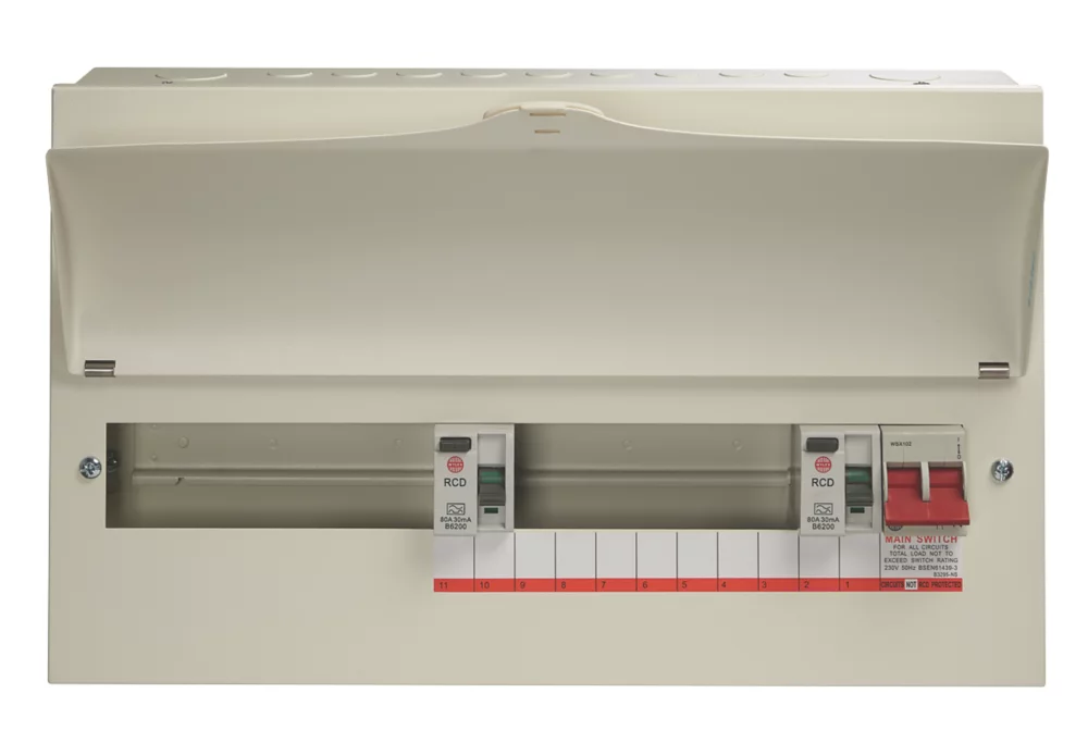 Dual RCD consumer unit with 100A double-pole mains switch. No-miss terminal, flexible busbar and cable-entry knockouts on five sides.